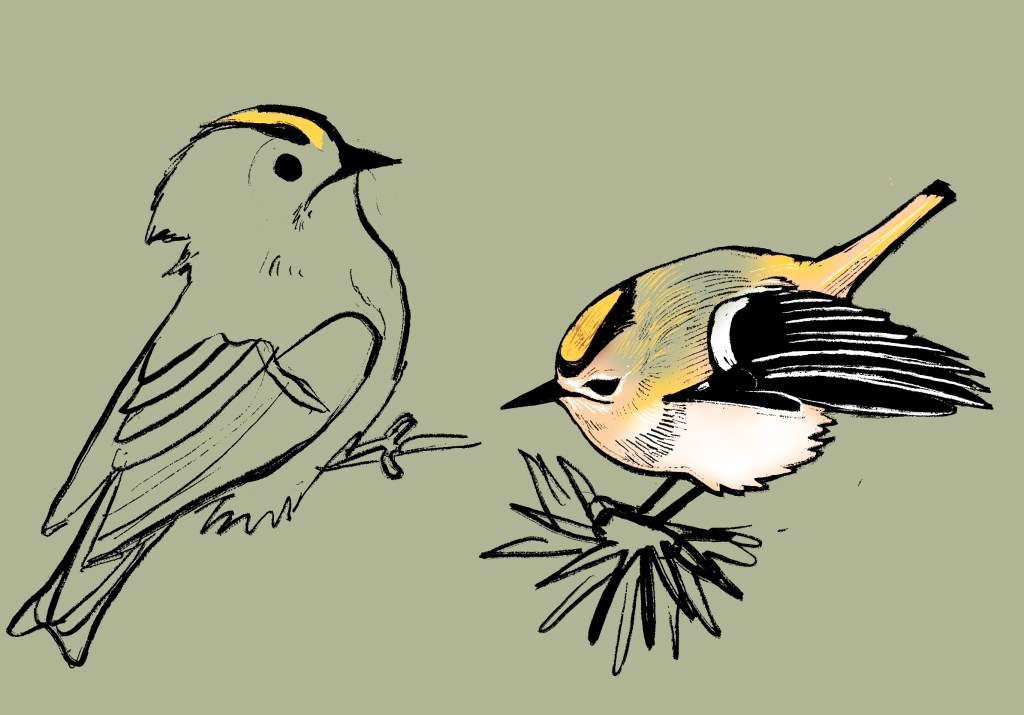 1. Lovely stuff Katie, love the illustration of the two Goldcrest birds, that would make perfect print for hanging on a wall, bigger the better.